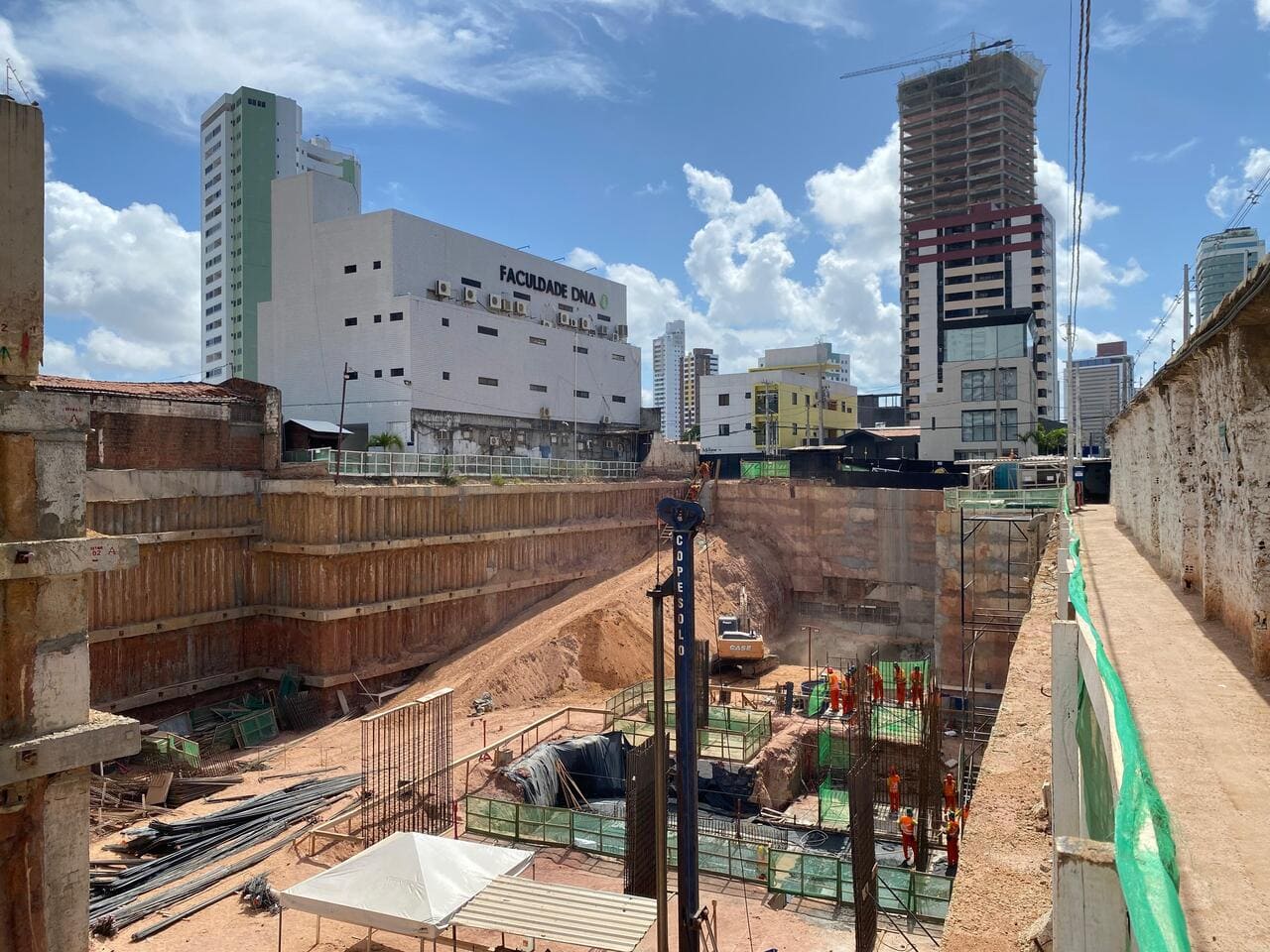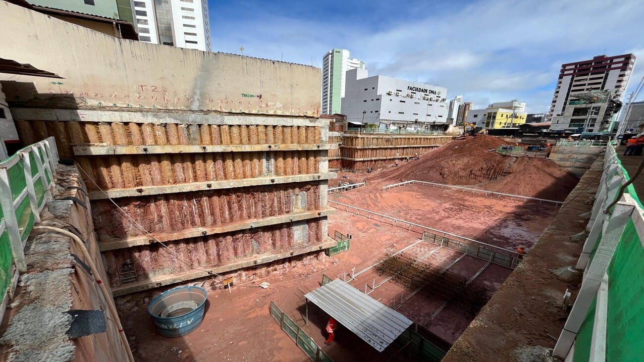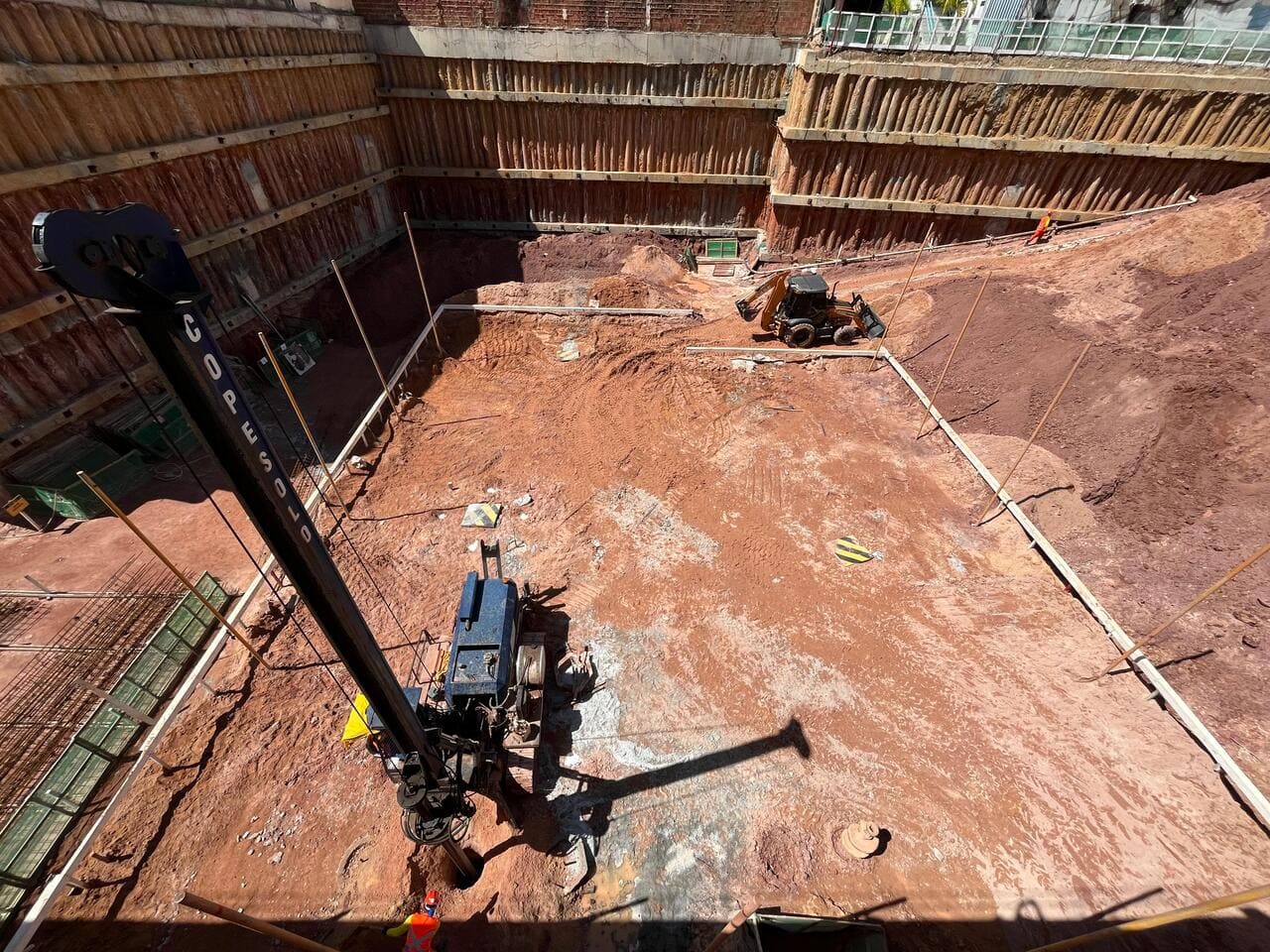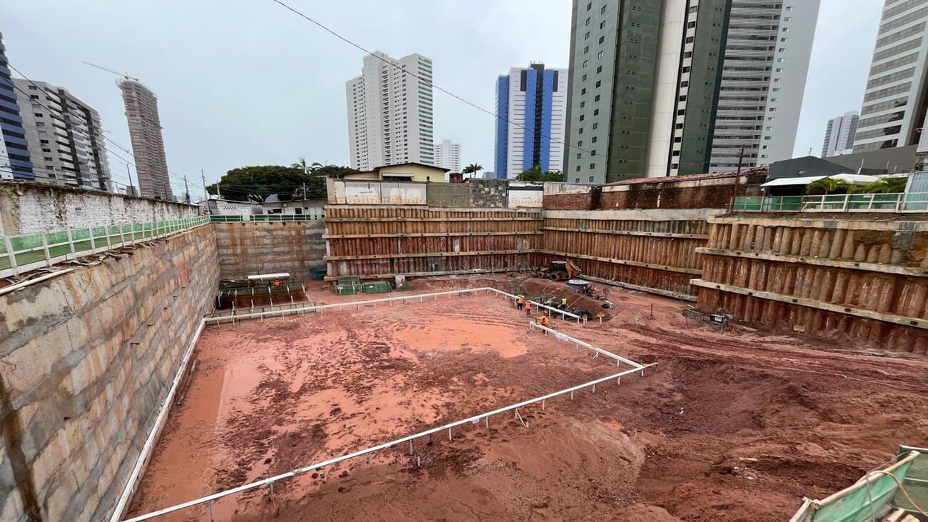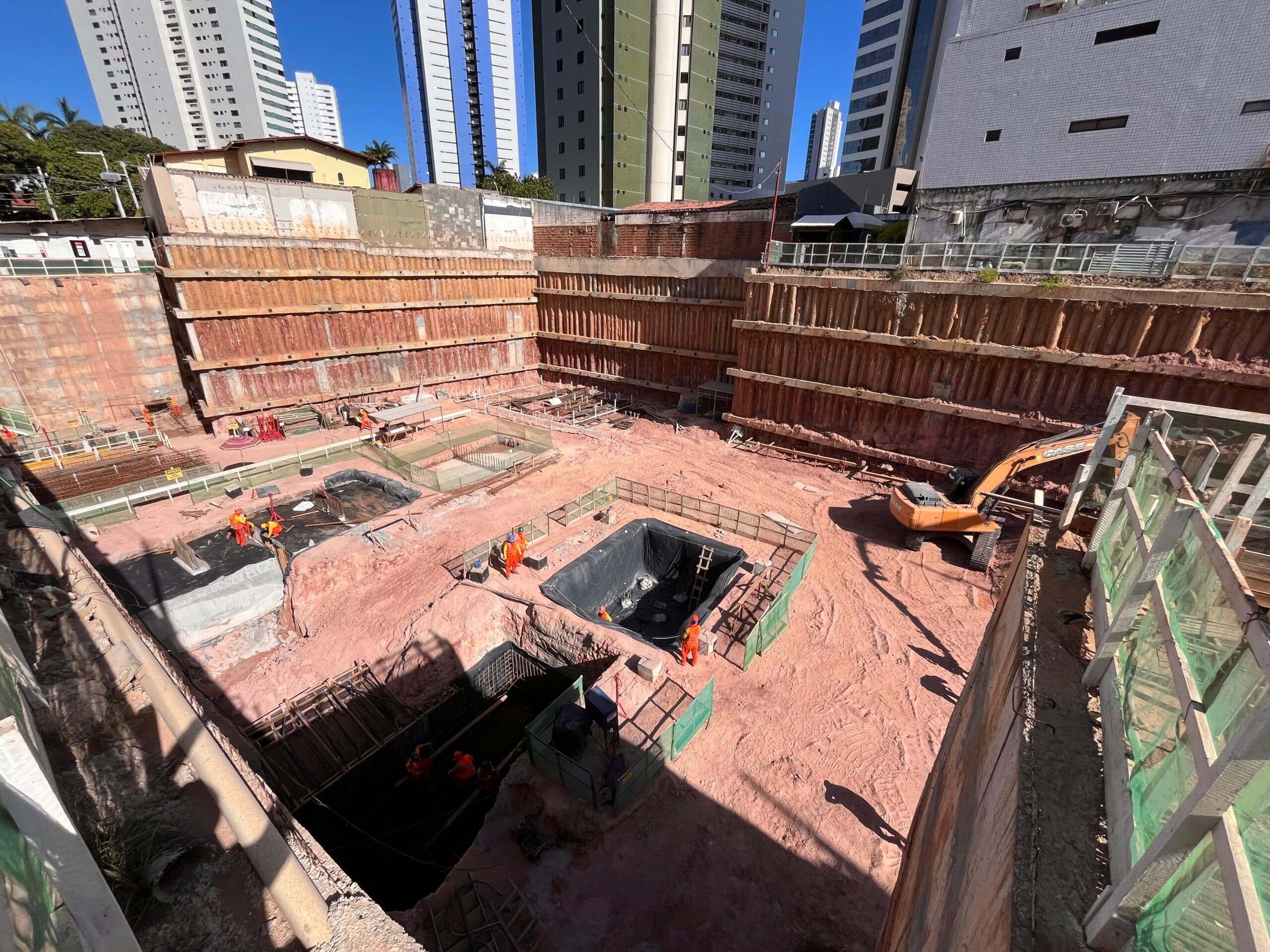 Remoção de terra para abrir espaço para as obras, fundações e instalações subterrâneas.