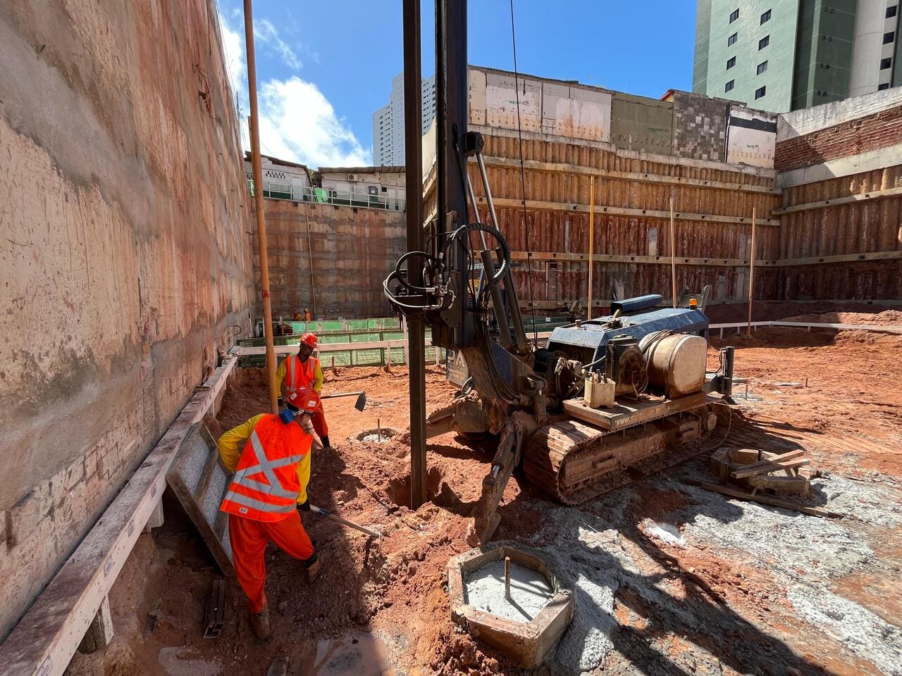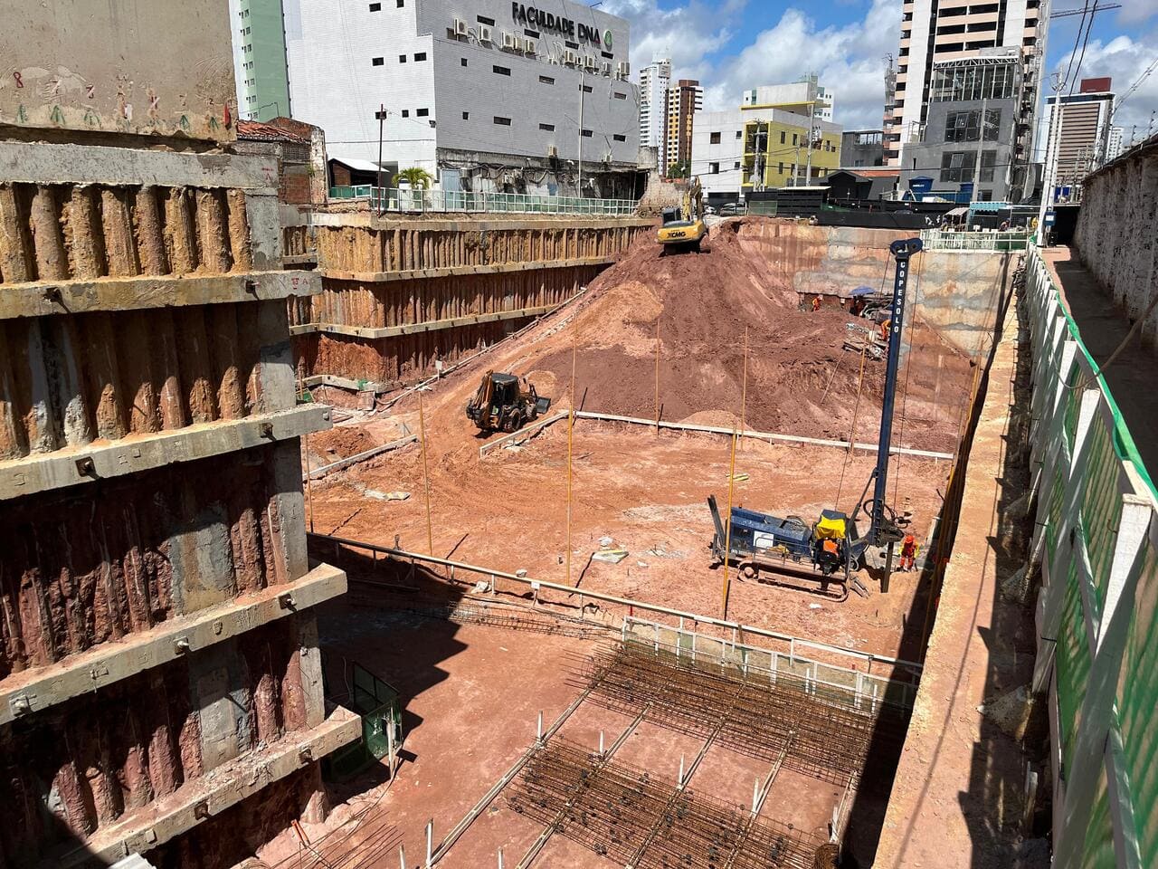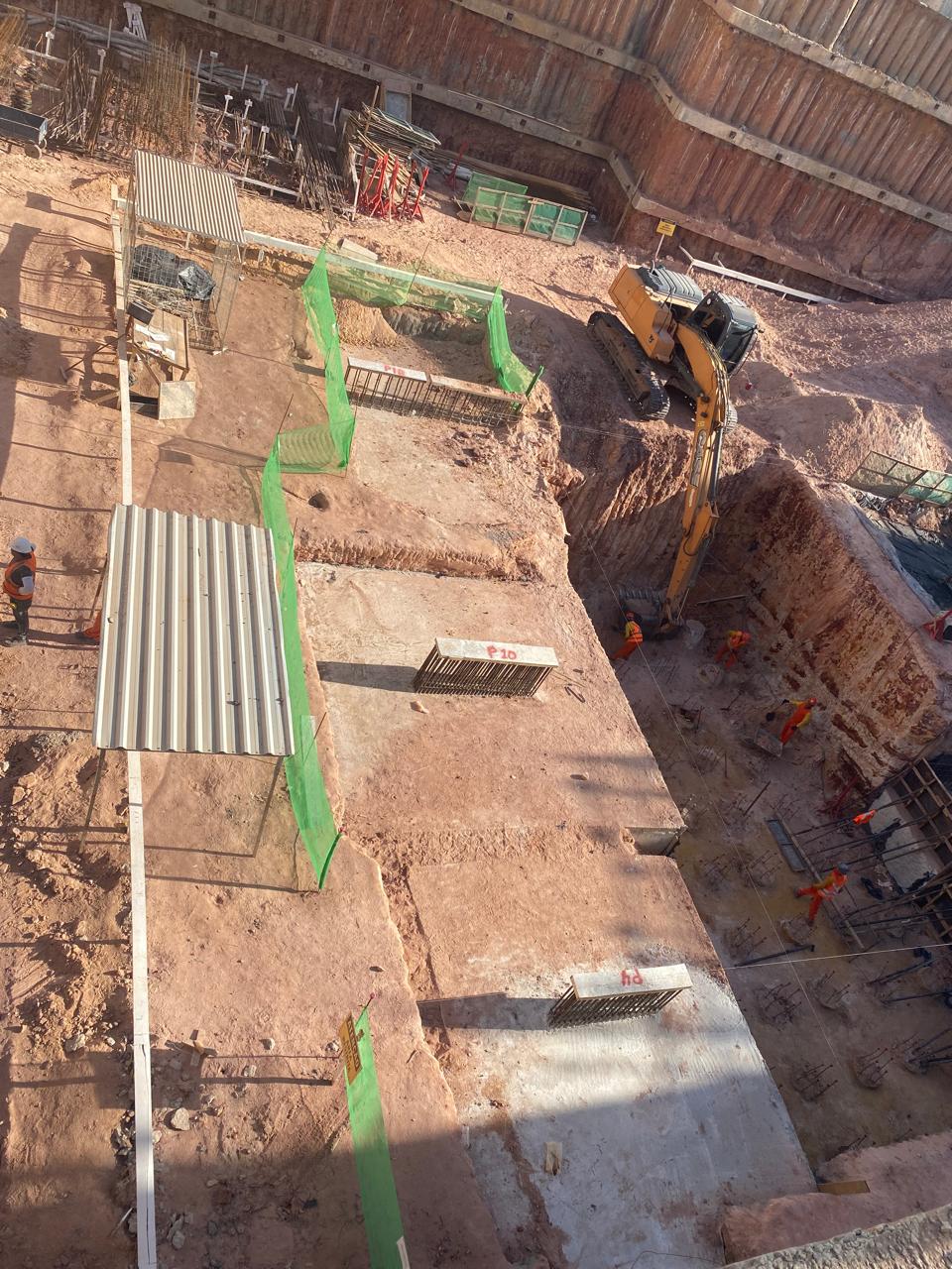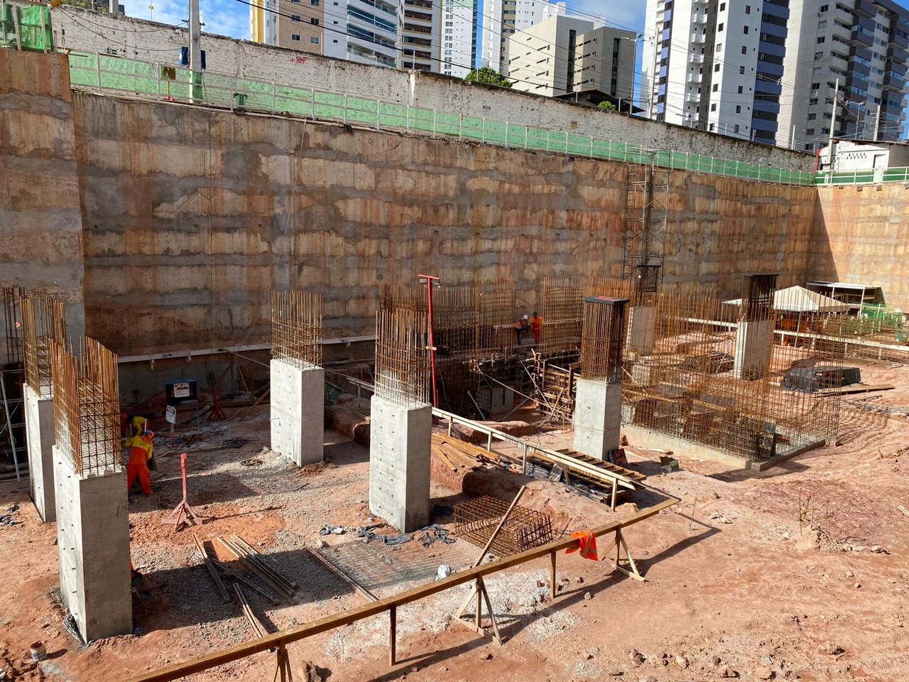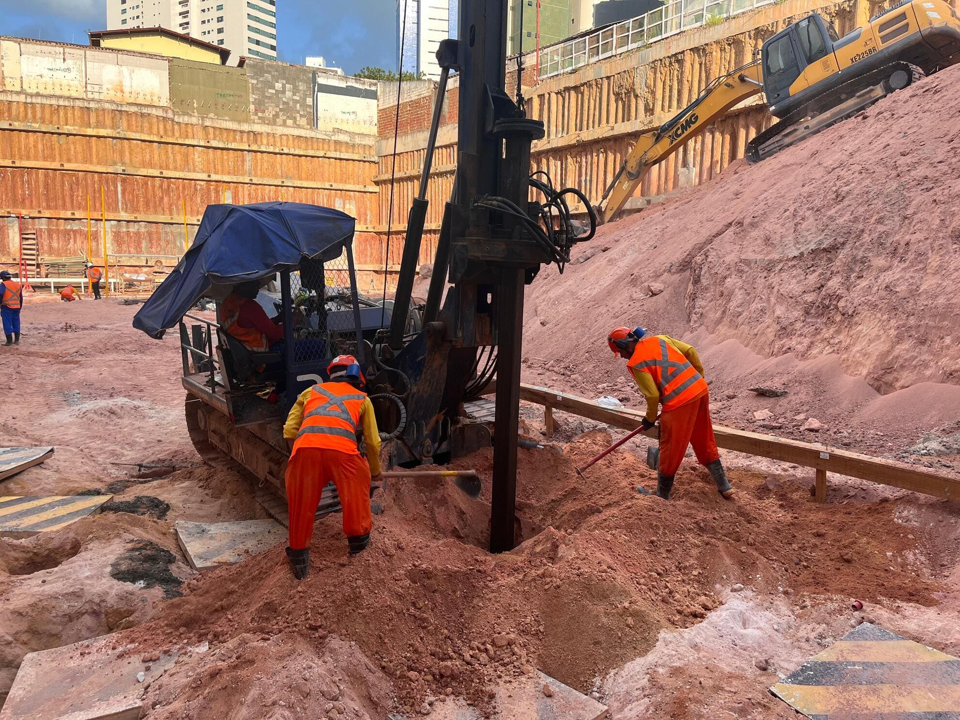 Remoção de terra para abrir espaço para as obras, fundações e instalações subterrâneas.