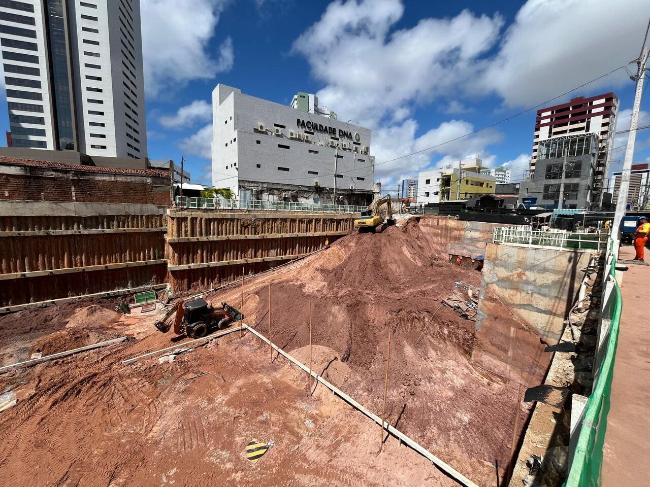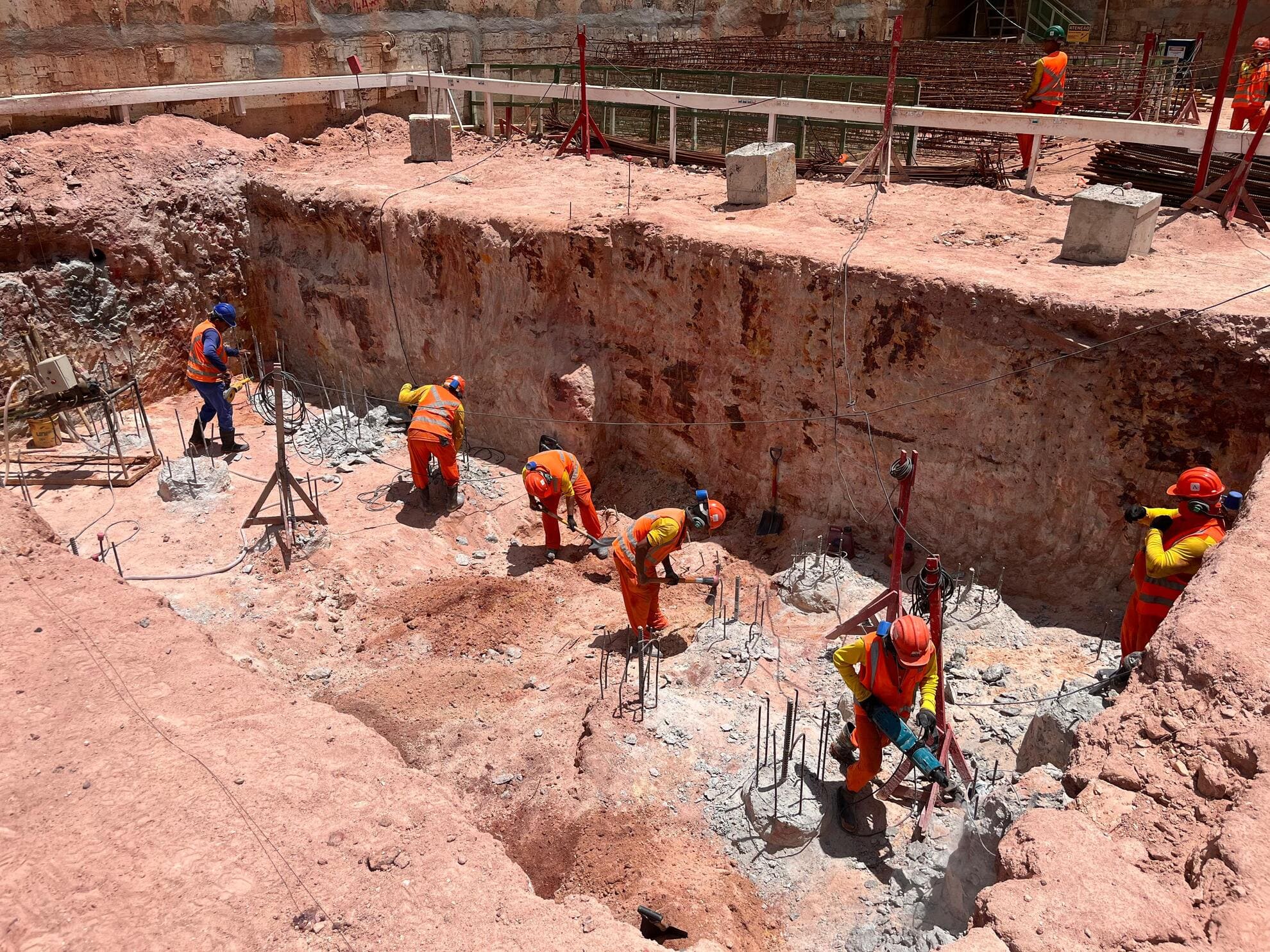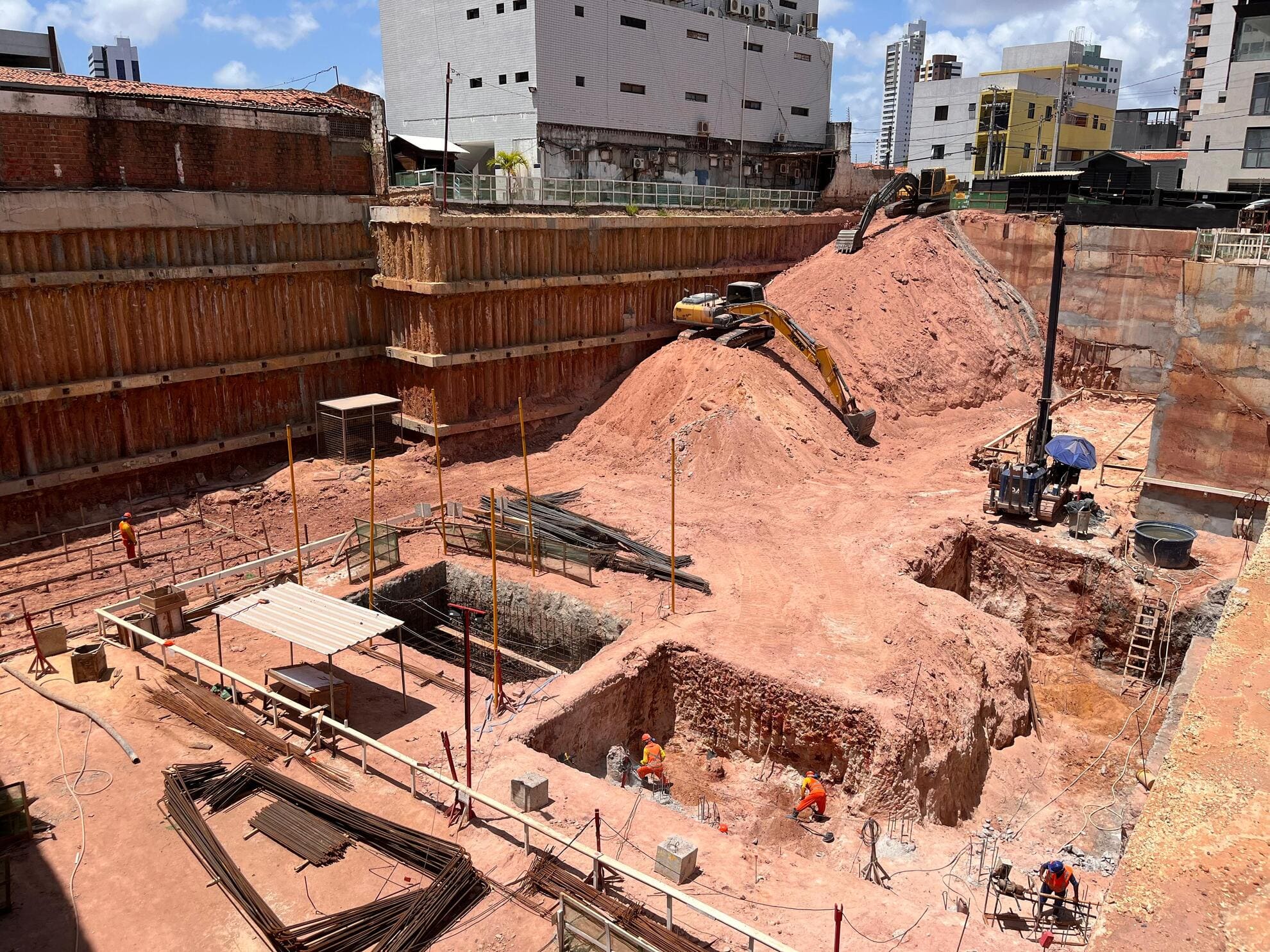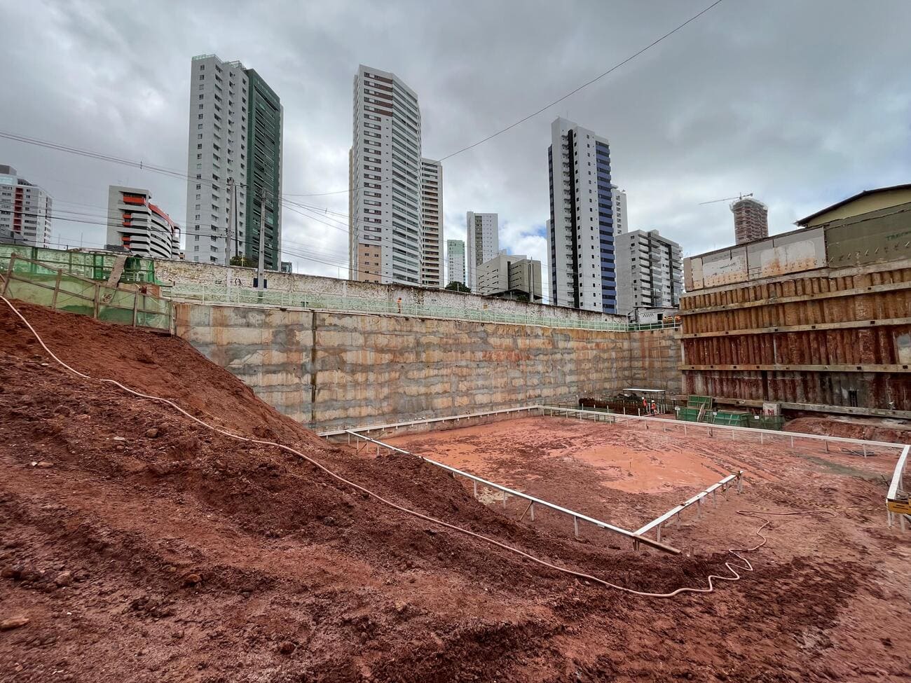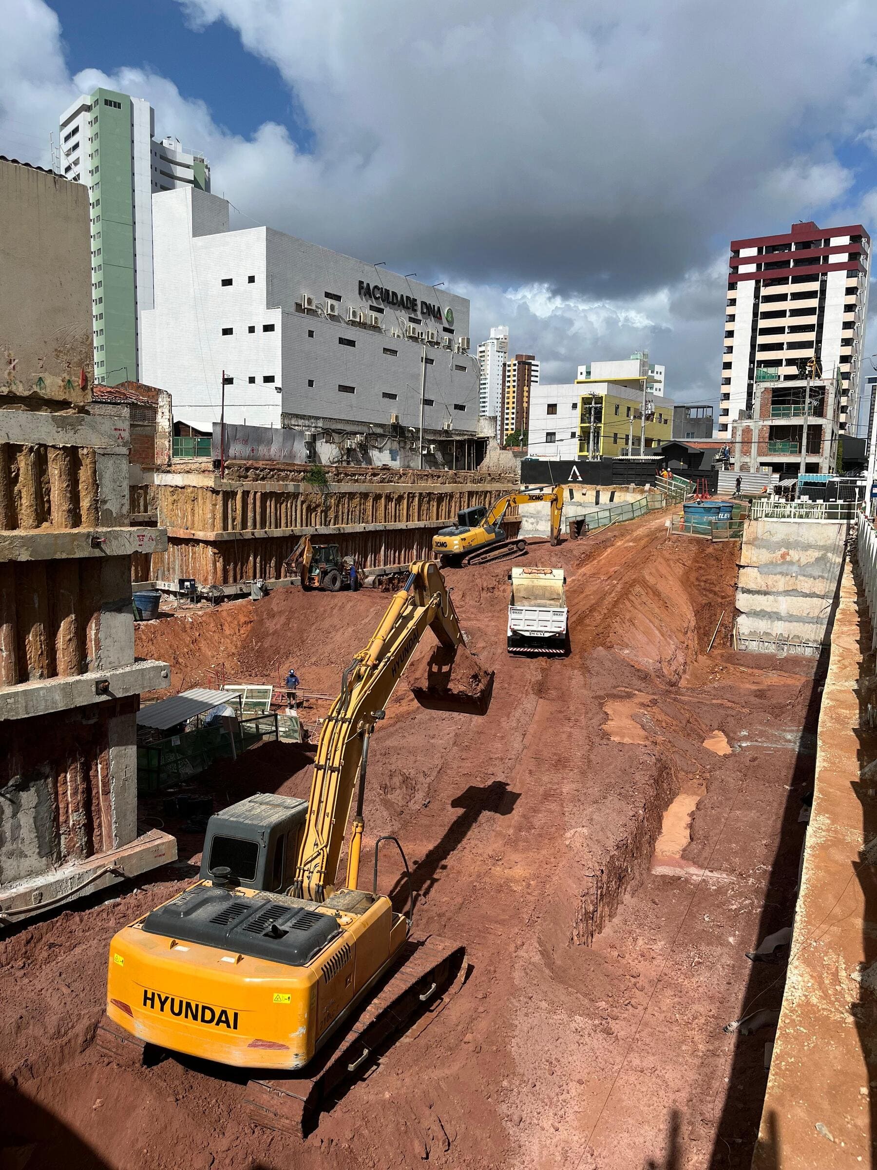 Remoção de terra para abrir espaço para as obras, fundações e instalações subterrâneas.