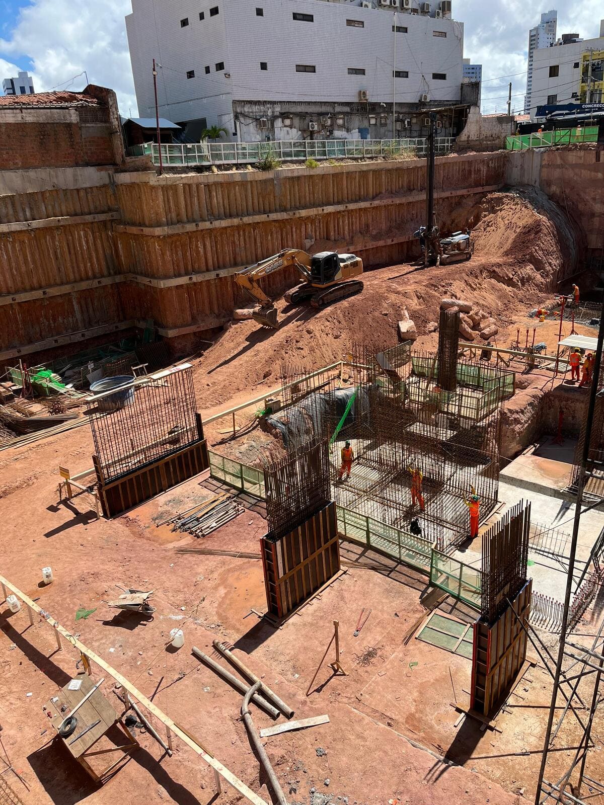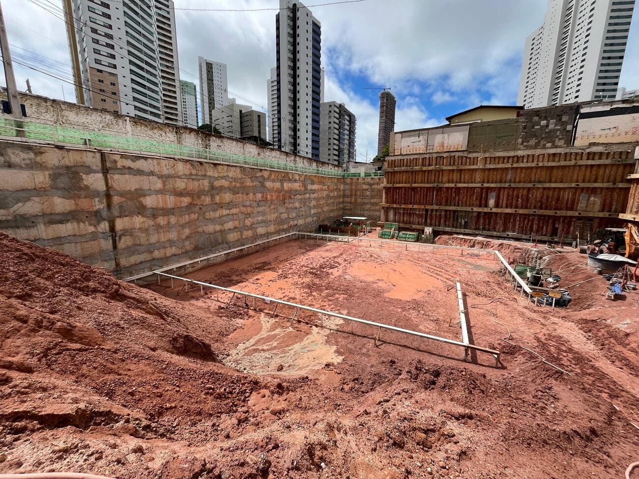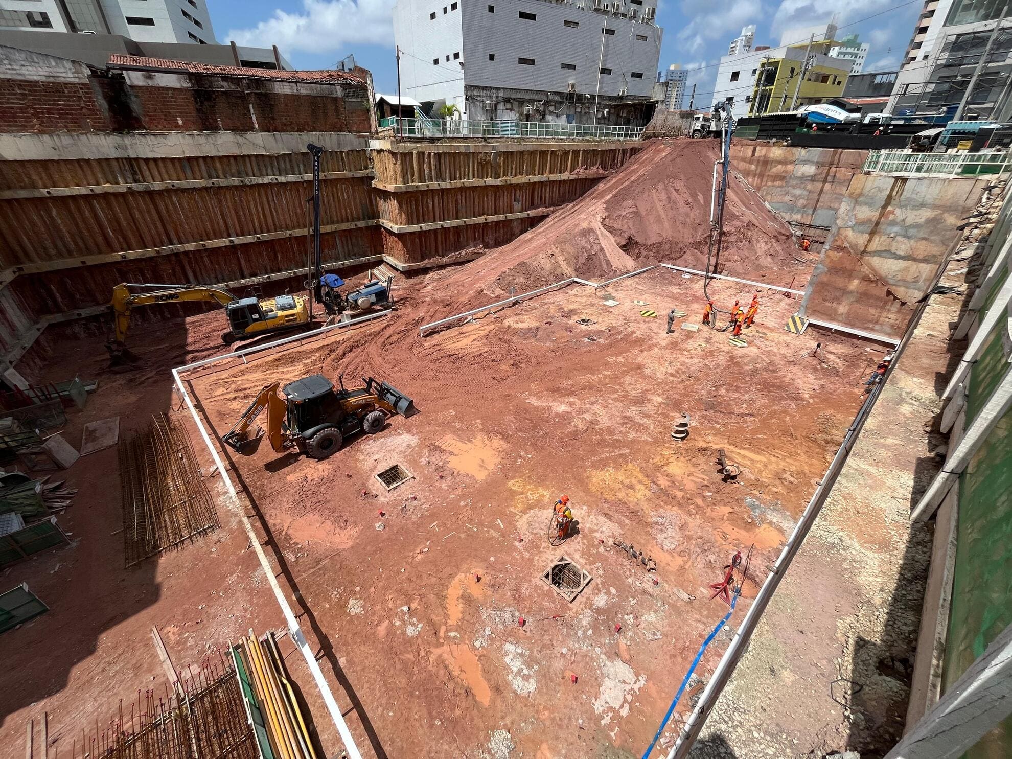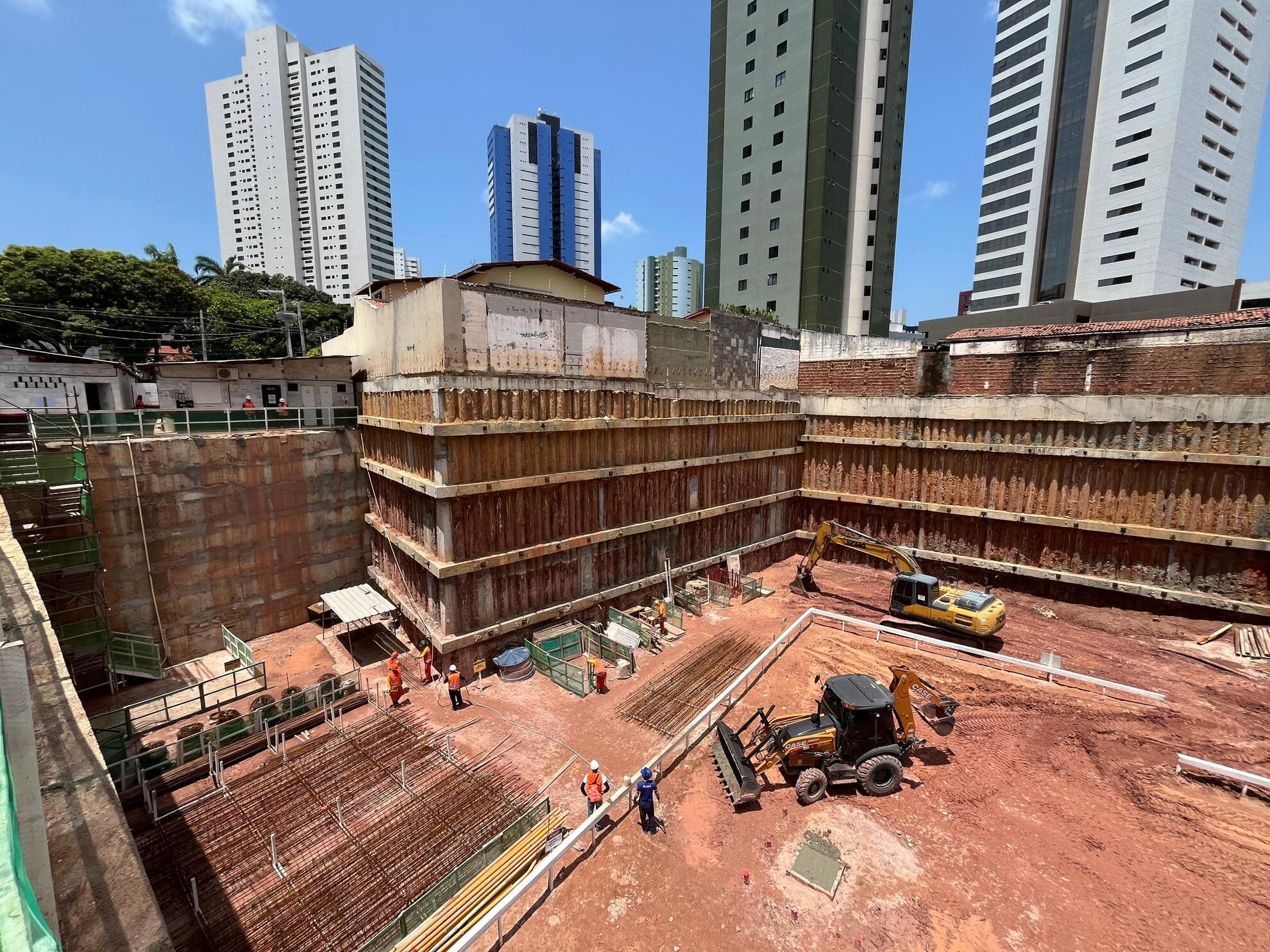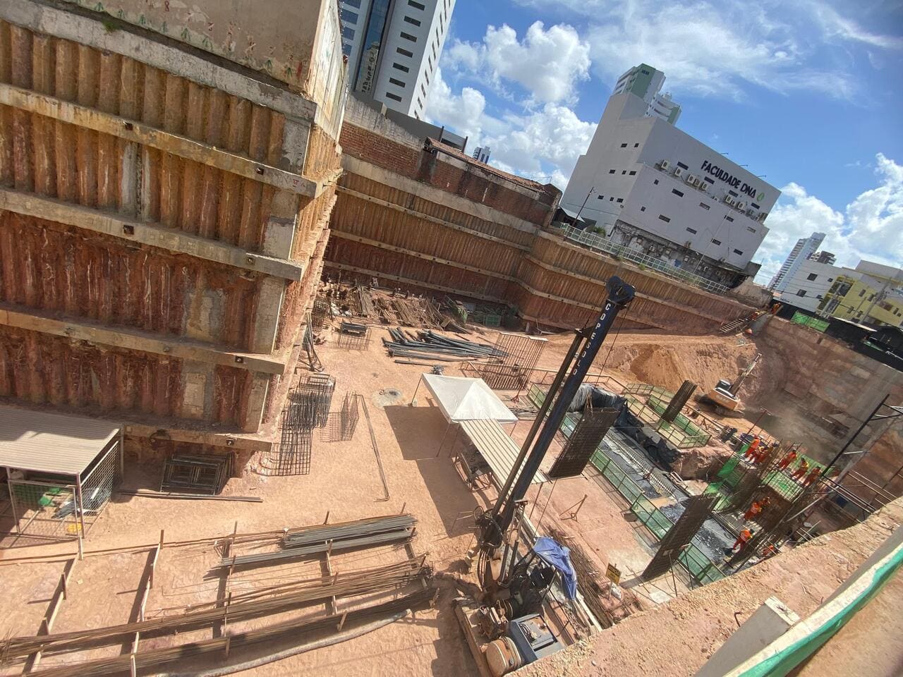 Remoção de terra para abrir espaço para as obras, fundações e instalações subterrâneas.